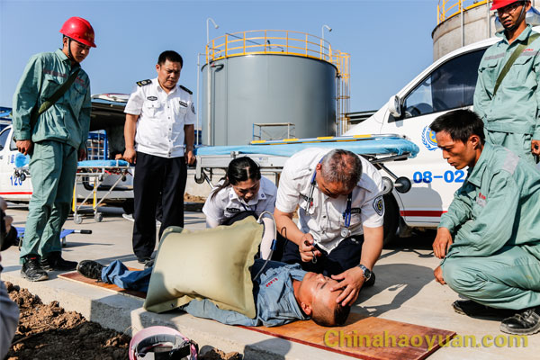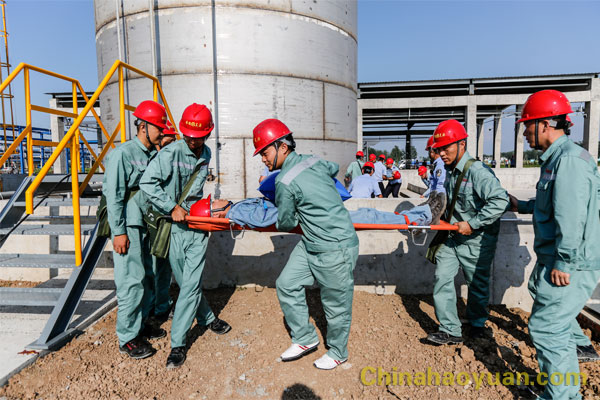 演练假想菜园子免费彩金园区正在建设的年产6000吨二甘醇胺项目配套罐区,某防腐公司4名员工对在建二甘醇胺储罐内部进行防腐受限空间作业,因天气炎热,通风不良,2名工人在罐内工作时先后晕倒,外面监护的1名工人呼叫没有反应,随即进入罐内施救,罐外还留一名工人监护。进入罐内救援的工人告诉外面监护人员,罐内闷热,呼吸困难,正准备将2名工人移出罐外,但是在移动罐内人员时感觉乏力,无法移动,施救人员也晕倒在罐内。罐外监护的工人赶紧寻求帮助,正好遇见路过此处巡检的操作人员,操作人员迅速了解情况,紧急将情况汇报公司领导。公司领导立即组织人员自救,联系120急救中心人员救援,并逐级向市应急局、市政府汇报事故情况。