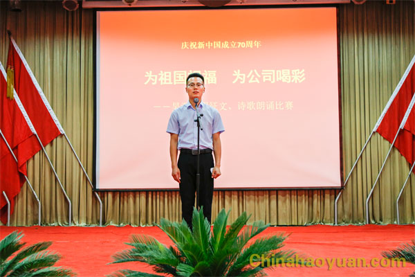 为庆祝新中国成立70周年,弘扬爱国主义精神,争做时代先锋,表达爱国、爱党、爱昊源的真挚感情, 凝聚公司建设“百亿规模、百年昊源”的精神动力,展现新时代工人良好形象,9月30日,由公司工会、团委举办的“庆祝建国七十周年,为祖国祝福、为公司喝彩”昊源集团演讲、朗诵比赛在公司大礼堂拉开帷幕。