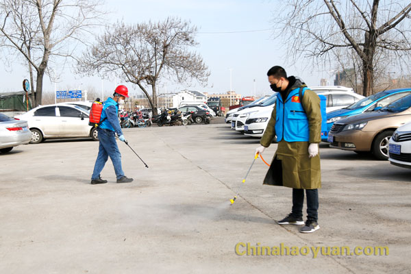 各自整理好后,大家背着消毒专用药桶,开始对公司办公楼前主干道路以及道路两旁的停车场、垃圾桶等设施进行了仔细的喷洒消毒,力求不放过每一个路面和死角。十多位青年志愿者经过近两个小时的奋战完成了这次消毒任务。