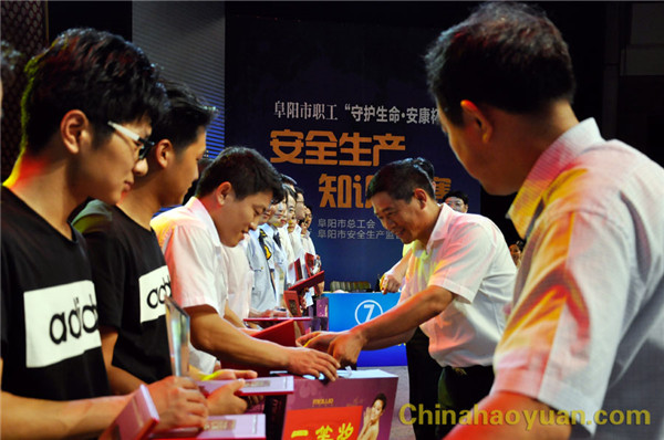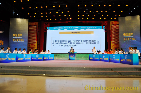 6月27日下午,由阜阳市总工会、阜阳市安监总局联合举办的阜阳市职工“守护生命.安康杯”安全知识竞赛在阜阳市电视台一号演播大厅举行,昊源集团代表队从全市18支代表队脱颖而出进入决赛。 比赛分为演讲表演和知识竞赛两个部分,,比赛现场气氛热烈,观众情绪高涨,选手们你追我赶,经过激烈角逐,菜园子免费彩金代表队获得第三名的好成绩。