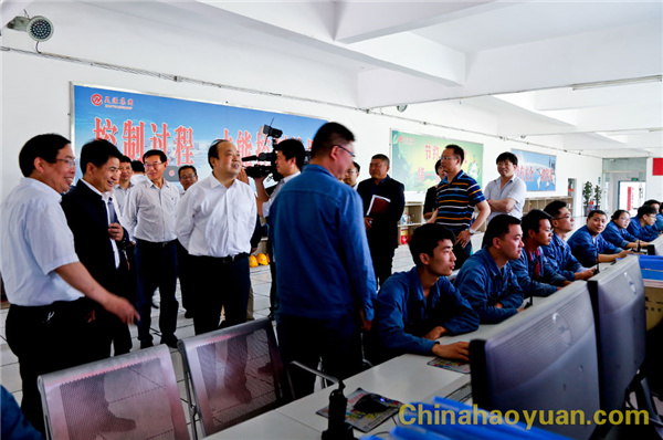 李平一行经公司4号尿素到航天炉系统综合控制中心,实地察看公司生产运行情况。一路上,两旁鲜花怒放、绿树成荫,与工业设备相互辉映,一派现代化花园式工厂景象。在航天炉系统综合控制中心,李平书记紧握一名操作人员的手,亲切地询问他的工作情况。